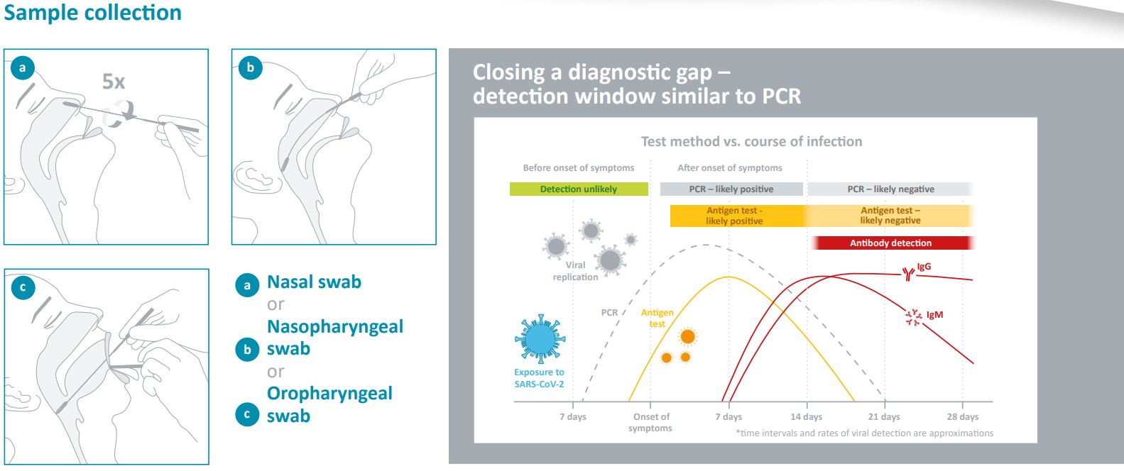 COVID-19 NADAL® IgG/IgM Rapid Test* påviser virussen indirekte. I modsætning hertil påviser COVID-19 NADAL® Ag Rapid Test den direkte ved at se på tilstedeværelsen af specifikke proteiner fra SARS-CoV-2-virus. Antigendetektion lukker således et diagnostisk hul.