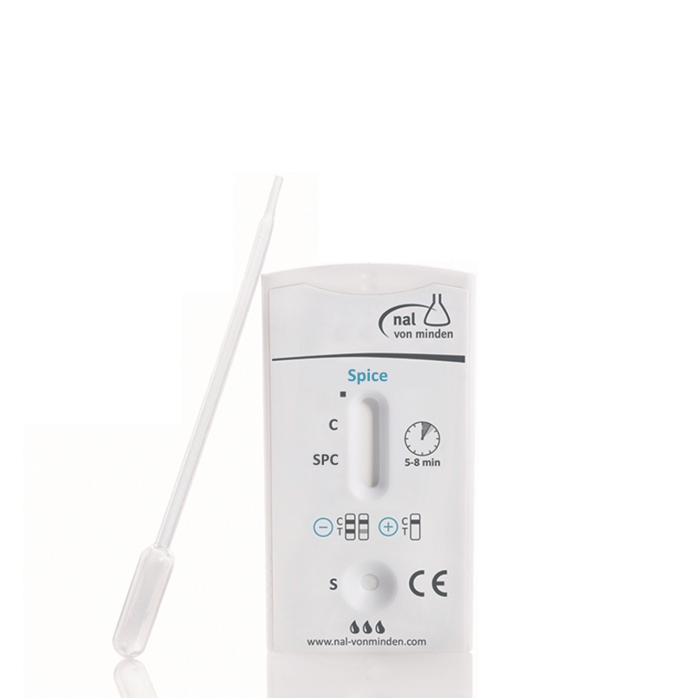 Nal von minden Drug-Screen® Spice-hurtigtesten er et konkurrencedygtigt immunoassay til kvalitativ påvisning af JWH-018 og JWH-073 i human urin og kan bruges som hjælp til at iværksætte eller overvåge behandlingstiltag. Som et in vitro-diagnostisk værktøj til professionel brug leverer testen et visuelt, foreløbigt analyseresultat.