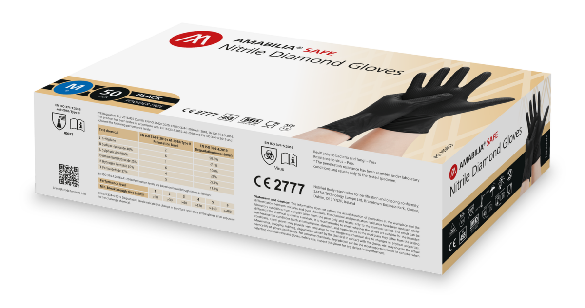 Kraftige Amabilia Safe nitrilhandsker med diamantstruktureret overflade giver enestående komfort, kvalitet og greb under våde og tørre forhold. Diamantteksturen giver et overlegen greb og holdbarhed og er cirka dobbelt så tyk som almindelige undersøgelseshandsker. Handskerne er meget elastiske, kemisk resistente og punkteringssikre, og de er ergonomisk designet til at passe perfekt og forhindre træthed i hænderne.