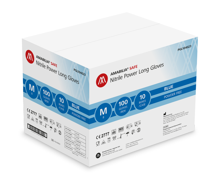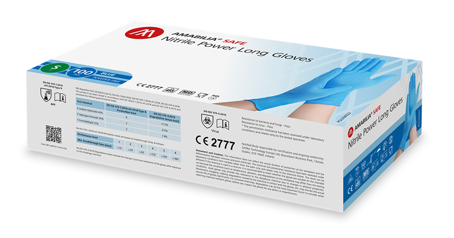 Amabilia Safes lange nitrilhandsker er ideelle til rengøring, sundhedspleje og kemikaliehåndtering og giver fremragende beskyttelse mod infektioner og kontaminering. Fås også i hvid.