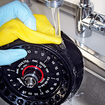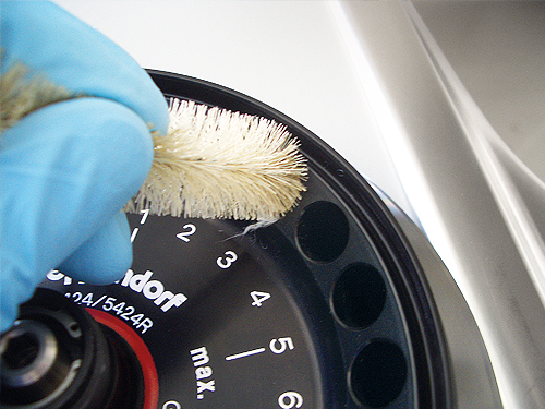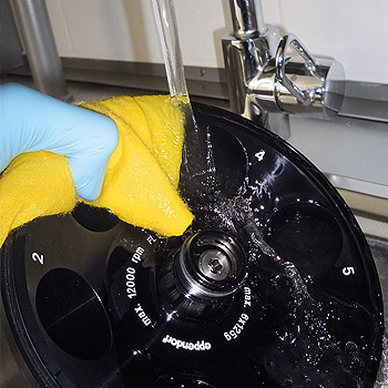 Generelt er desinfektion med en klud mere effektiv end at sprøjte væsker på centrifugen, hvilket også kan resultere i en kortslutning inde i centrifugehuset. Efter rengøring med rengøringsmiddel skal gummipakningerne i rotorkammeret skylles godt med destilleret vand og smøres med glycerin for at forhindre, at de bliver skøre.