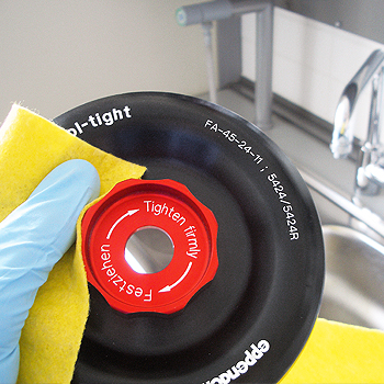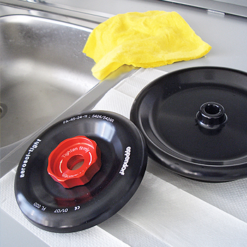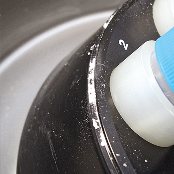 Når du har rengjort dit udstyr, skal du tage en lille mængde centrifugesmøremiddel – som polyethlenglycol (PEG) fedt fra Eppendorf – på din finger. Smør spandens riller, svingspandens rotorer og gummipakninger. Rotorkammertætninger kan smøres med standard laboratoriekvalitet glycerol eller talkum. Kontroller, om tætningerne på aerosoltætte låg/kapsler skal udskiftes, da aerosoltæthed kun er mulig med ubeskadigede tætninger. Smør gevindene på rotorer med fast vinkel efter rengøring og autoklavering. Let voksbehandling af anodiserede rotoroverflader kan også forlænge levetiden. Brug en blød klud til voksproceduren.