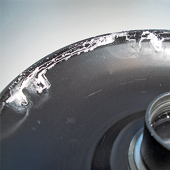 • Foretag en detaljeret inspektion af centrifugerotoren, rotorlåget og spandene for revner og korrosion. For en rotor med fast vinkel skal du tjekke under rotoren samt rørboringerne. For en rotor med svingspand skal du være særlig opmærksom på drejetapperne og rillerne. Skeln klart mellem en ridse og en fordybning (= mere end beskadiget farve), når du vurderer din rotor. En rotor med en rille eller endda en lille revne skal udskiftes. På grund af fremstillingsprocessen kan der forekomme farvevariationer på rotorer, der er mærket “coated”. Disse farvevariationer påvirker ikke levetiden eller modstandsdygtigheden over for kemikalier.